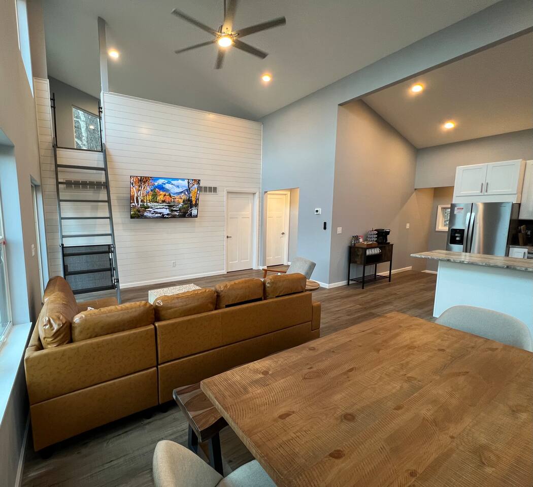 Indulge in ultimate entertainment on the 1st floor, featuring a ping pong table, foosball table, and a multicade for endless fun. Unwind on the comfortable couch while immersing yourself in movies or games on the impressive 65" HDTV. Step out onto the private hot tub deck, enveloped in relaxation and surrounded by tranquility. Retreat to the spacious bedroom, furnished with a queen bed, a versatile futon couch, and a 55" HDTV. The second floor unveils a culinary haven, with a chef's kitchen ready to inspire your culinary creations. Relax in the inviting main living room and relish delightful meals in the elegant dining area. Refresh in the convenient second bathroom. Discover two beautifully appointed bedrooms, including a master bedroom with a luxurious king bed, a desk with a makeup mirror, and a 55" HDTV. The second bedroom offers a queen bed, a desk with a makeup mirror, and another 55" HDTV. Ascend to the enchanting 3rd floor loft, aptly named the "treehouse," offering a unique and captivating experience. Climb the ship ladder to this cozy retreat, adorned with two comfortable twin beds and boasting the most breathtaking views within the cabin. Immerse yourself in the beauty of nature from this elevated vantage point. Welcome to a haven of entertainment, comfort, and scenic beauty, where each floor of this charming cabin holds its own unique treasures.